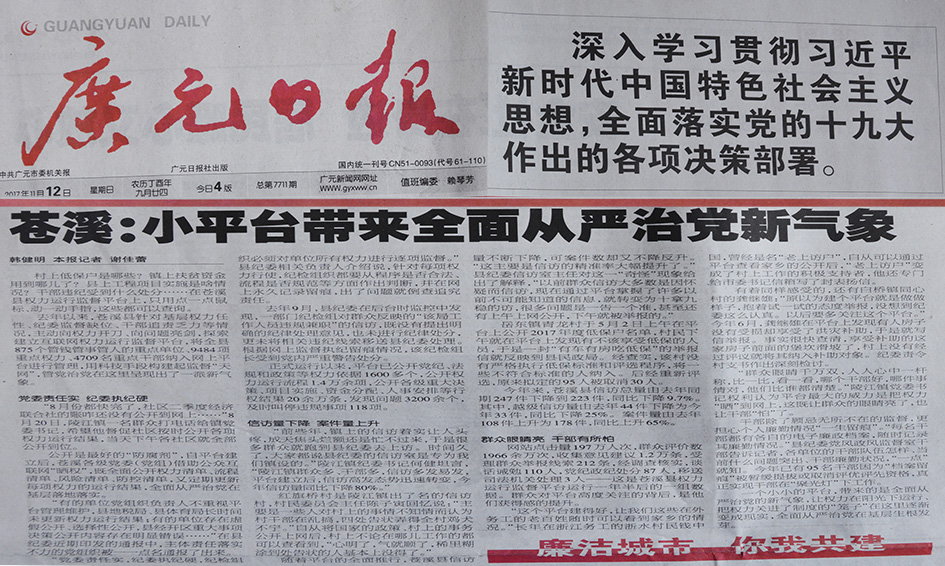 10月5日,四川日报头版关注报道苍溪建科技“天网” 治理“微腐败”。 最近,广元市苍溪县元坝镇纪委在“苍溪县权力运行监督平台”查看土门村公益项目运行情况时,发现该村存在弄虚作假情况,村干部被及时问责。 这是苍溪县解决群众身边不正之风和腐败问题的一个镜头。2016年以来,苍溪县探索建立权力运行监督机制,用科技手段构建起治理“微腐败”的“天网”,推动全面从严治党向基层延伸,其经验做法被中央纪委在“党风廉政建设创新成果展示平台”上推荐。 借助互联网“晒”五张清单9月30日,记者从苍溪政府网站端口进入“苍溪县权力运行监督平台”。平台上一单位一页面,这些单位包括县四大机构、党政部门、乡镇和村(社区)等,每个单位都有“权力清单”,每项权力都有“流程清单”和“结果清单”,每个权力运行节点都有廉政“风险清单”和“防控清单”。点击进入龙山镇塘山村,只见该村共有农村低保评议申报权等8项重点权力。同时,每个村干部都开设了网页展示其权力运行情况。在低保申报权下,既有相关政策依据,也有该村今年每名低保户基本情况和补助标准。 “公开是最好的‘防腐剂’,我们用互联网‘晒权’,为打通从严治党在基层的‘最后一公里’奠定了基础。”苍溪县委书记张寿于介绍,把从县委书记、县长到普通干部都纳入平台,“对全县875个单位、4709名干部实现权力运行公开。还公开各级重大决策、项目实施、人事安排等行权结果30余万条。”全民参与对权力运行实时监督 该平台后台设在县纪委。今年3月,县纪委在后台监督发现县文广新局工会费用支出突增,于是将该单位纳入检查重点,并及时对其进行问责。“苍溪各级纪检组织都可在该平台上按权限对权力进行监督,发现问题立即启动预警程序。”县纪委书记王永介绍。 该平台每一个页面下,都设有评价和举报功能且直通后台,既可对干部评价、举报,又能对权力事项展开评价、举报。苍溪群众可通过手机、电脑端,随时随地参与监督。 白桥镇白桥村村民郑明通过该平台发现村干部罗某在低保户认定中优亲厚友,便直接在平台上举报。镇纪委查实后,罗某被处分。 对纪委发现问题和群众网上举报,该县统一办结时限和公开结果。自去年5月平台正式运行以来,已受理群众举报线索212条,经调查核实,党纪政纪处分87人,移送司法机关处理3人。 同时,群众对干部的评判结果还在平台上生成干部电子廉洁档案。档案随人走,终身留痕。目前,平台点击已达190余万次,评价总数达1835万人次。