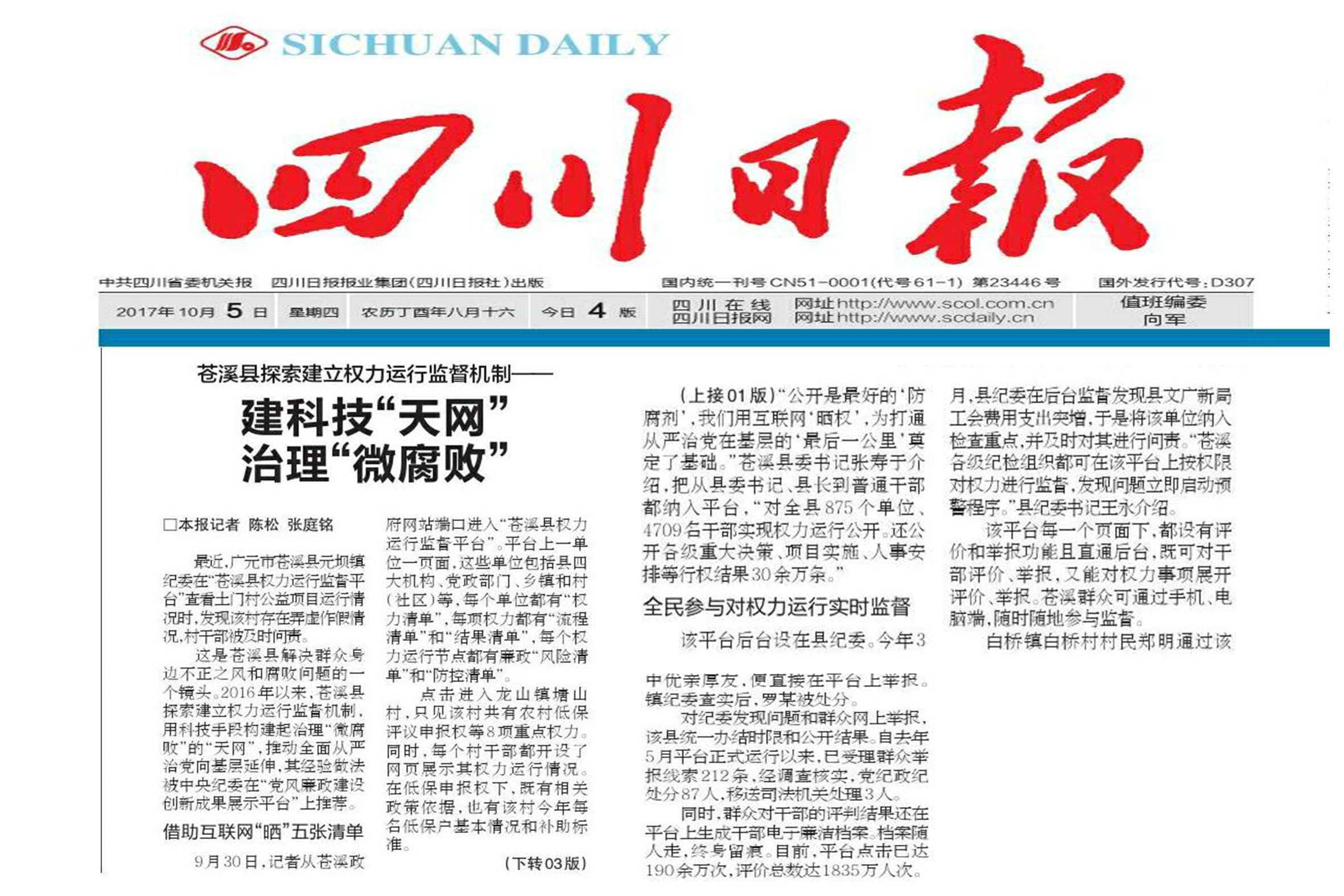 10月5日,四川日报头版关注报道苍溪建科技“天网” 治理“微腐败”。 最近,广元市苍溪县元坝镇纪委在“苍溪县权力运行监督平台”查看土门村公益项目运行情况时,发现该村存在弄虚作假情况,村干部被及时问责。 这是苍溪县解决群众身边不正之风和腐败问题的一个镜头。2016年以来,苍溪县探索建立权力运行监督机制,用科技手段构建起治理“微腐败”的“天网”,推动全面从严治党向基层延伸,其经验做法被中央纪委在“党风廉政建设创新成果展示平台”上推荐。 借助互联网“晒”五张清单9月30日,记者从苍溪政府网站端口进入“苍溪县权力运行监督平台”。平台上一单位一页面,这些单位包括县四大机构、党政部门、乡镇和村(社区)等,每个单位都有“权力清单”,每项权力都有“流程清单”和“结果清单”,每个权力运行节点都有廉政“风险清单”和“防控清单”。点击进入龙山镇塘山村,只见该村共有农村低保评议申报权等8项重点权力。同时,每个村干部都开设了网页展示其权力运行情况。在低保申报权下,既有相关政策依据,也有该村今年每名低保户基本情况和补助标准。 “公开是最好的‘防腐剂’,我们用互联网‘晒权’,为打通从严治党在基层的‘最后一公里’奠定了基础。”苍溪县委书记张寿于介绍,把从县委书记、县长到普通干部都纳入平台,“对全县875个单位、4709名干部实现权力运行公开。还公开各级重大决策、项目实施、人事安排等行权结果30余万条。”全民参与对权力运行实时监督 该平台后台设在县纪委。今年3月,县纪委在后台监督发现县文广新局工会费用支出突增,于是将该单位纳入检查重点,并及时对其进行问责。“苍溪各级纪检组织都可在该平台上按权限对权力进行监督,发现问题立即启动预警程序。”县纪委书记王永介绍。 该平台每一个页面下,都设有评价和举报功能且直通后台,既可对干部评价、举报,又能对权力事项展开评价、举报。苍溪群众可通过手机、电脑端,随时随地参与监督。 白桥镇白桥村村民郑明通过该平台发现村干部罗某在低保户认定中优亲厚友,便直接在平台上举报。镇纪委查实后,罗某被处分。 对纪委发现问题和群众网上举报,该县统一办结时限和公开结果。自去年5月平台正式运行以来,已受理群众举报线索212条,经调查核实,党纪政纪处分87人,移送司法机关处理3人。 同时,群众对干部的评判结果还在平台上生成干部电子廉洁档案。档案随人走,终身留痕。目前,平台点击已达190余万次,评价总数达1835万人次。